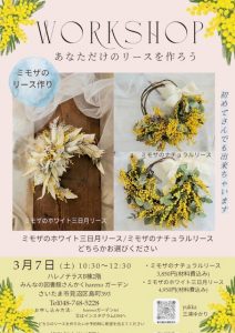 3月7日(土)のWORKSHOPのご案内です。 春の訪れを告げる黄色いお花 『ミモザのリース作り』 初めてさんでも作れる 私だけのリースを作ろう!