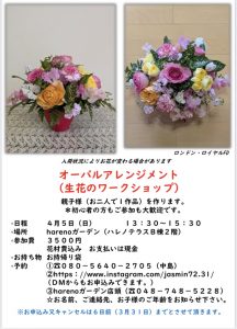 WORKSHOPのご案内です 4月5日(日) 13:30~15:30 生花を使ったワークショップ ~オーバルアレンジメント~ アレンジメントはヨーロピアンスタイルで 基本の形が学べますよ! 初心者の方も楽しくご参加できます!みなさんの参加お待ちしております ※入荷状況によりお花が変わる場合があります ※お申込み・キャンセルは3月31日までです